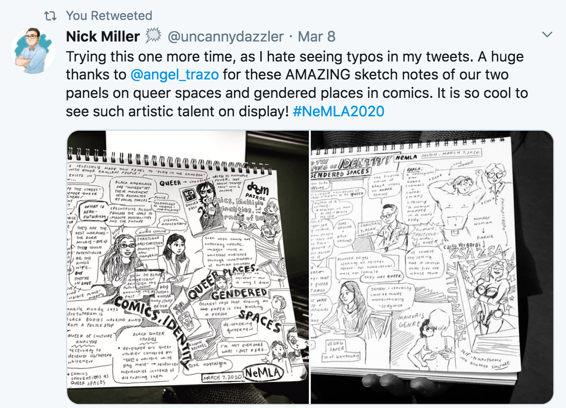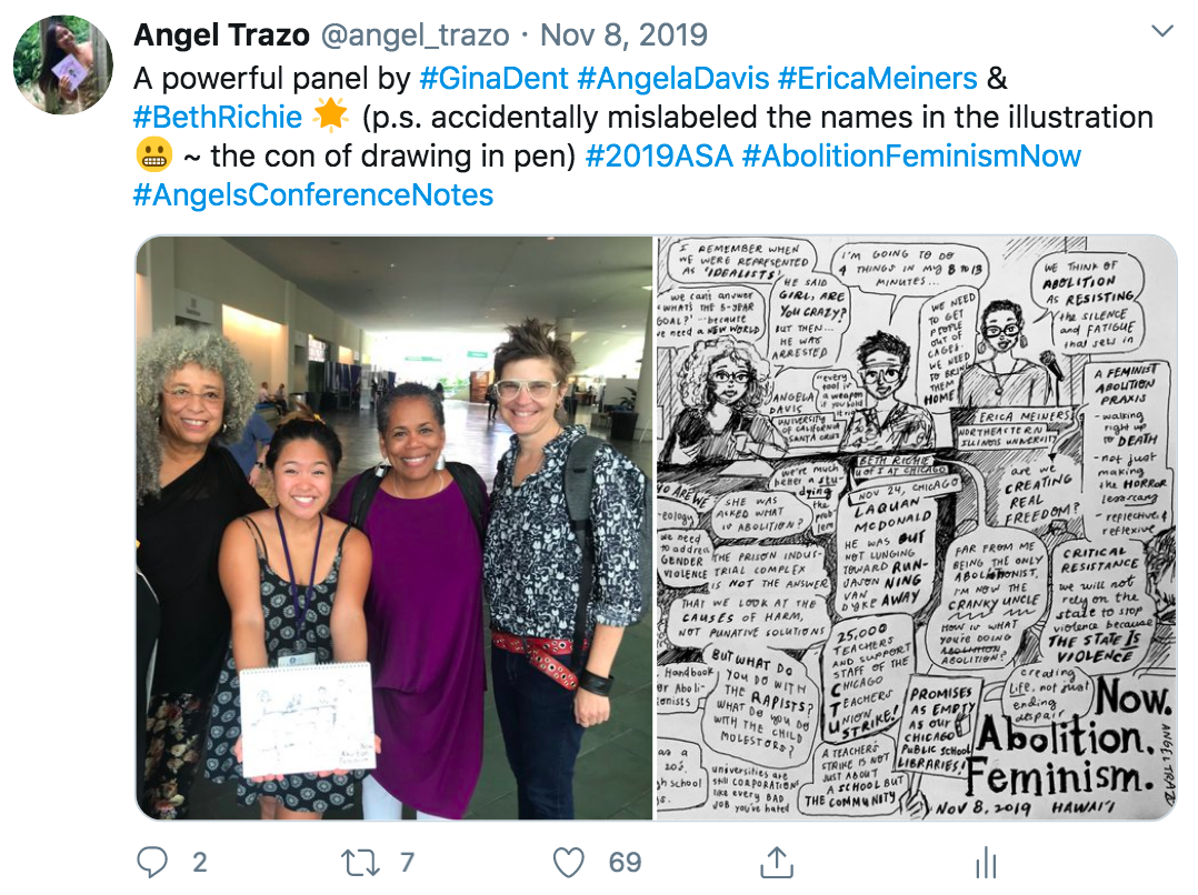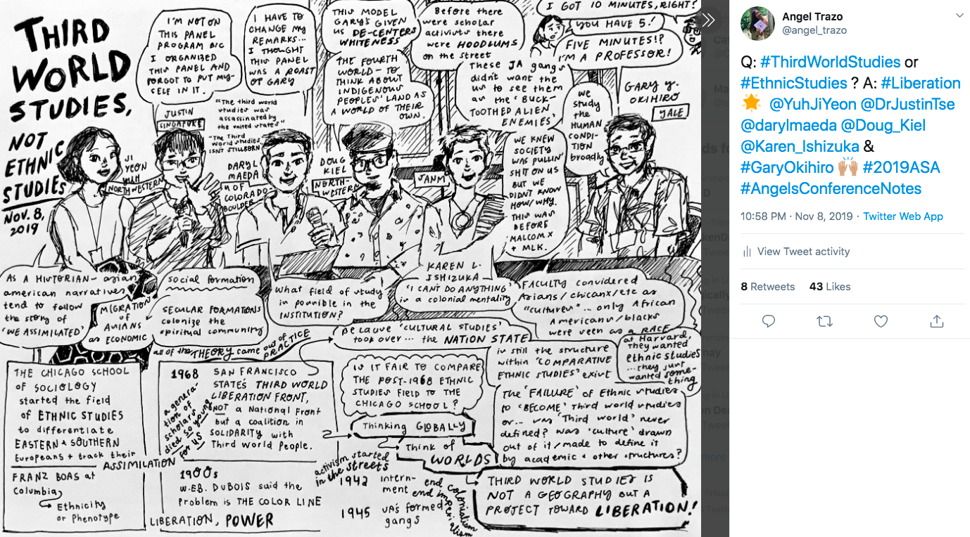 In real-time during an event, I combine sketches, hand-written notes, and inspiration from my physical context to create what I call 'visual-notes' or 'notes & doodles.' Onlookers often liken my work to the practice of 'graphic recording' or 'graphic facilitation,' others to comic book illustration. I began this style of note-taking with the project Notes & Doodles' (2016-2017) I created as part of my college art thesis. The style of my practice developed more-or-less organically, as I have always been one to add illustrations or diagrams to my classnotes. I'd also just taken a seminar on figure drawing and happily used my environment to practice sketching the human form. This project continues as a (somewhat) daily practice. Overall, I see 'visual-notetaking' as the best way I know how to keep focused during lectures and conferences, by taking notes I can reference in the future. Read my Amerasia piece on how I use visual notetaking as Asian American art practice here.