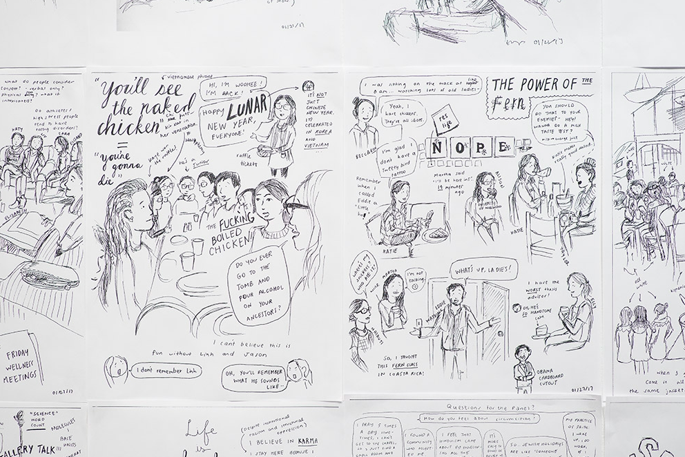 Most importantly, Notes & Doodles tells stories. This piece itself is a large, fragmented narrative, which, when brought together, tells the story of Colgate from multiple spaces, perspectives, and identities. While the initial purpose of this piece was to document interactions at Colgate, another concept behind this piece was self-representation. I wanted to express daily life through the eyes of a senior, double-major in Biology and Studio Art, through the lense of an Asian woman, through the lens of a student of color on a predominantly-white campus. This work, in a sense, is a reclamation of my Asian identity and normalization of my intersectional perspective. This work does not claim to represent the greater Asian American community; it merely shows a facet of what the Asian, first-generation perspective can be.