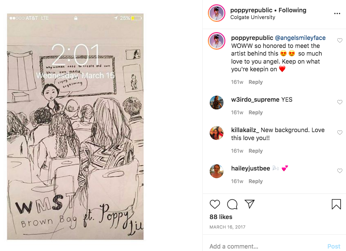 Shoutout from Chinese-American activist, artist, actress, and fellow Colgate alumnus, Poppy Liu.