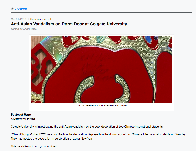 Trazo, Angel. "Anti-Asian Vandalism on Dorm at Colgate University." March 31, 2018. AsAmNews.